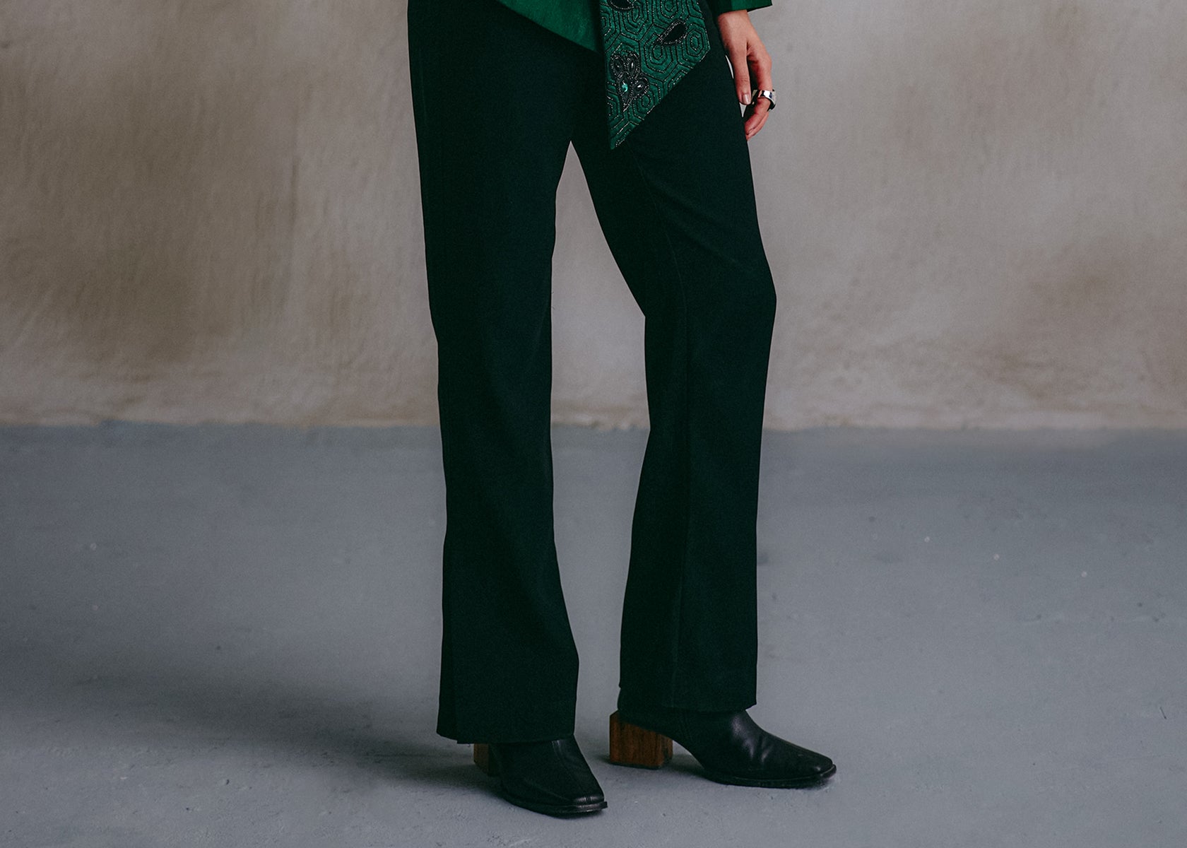Tailored black trousers with clean lines that ground the look in quiet structure.
