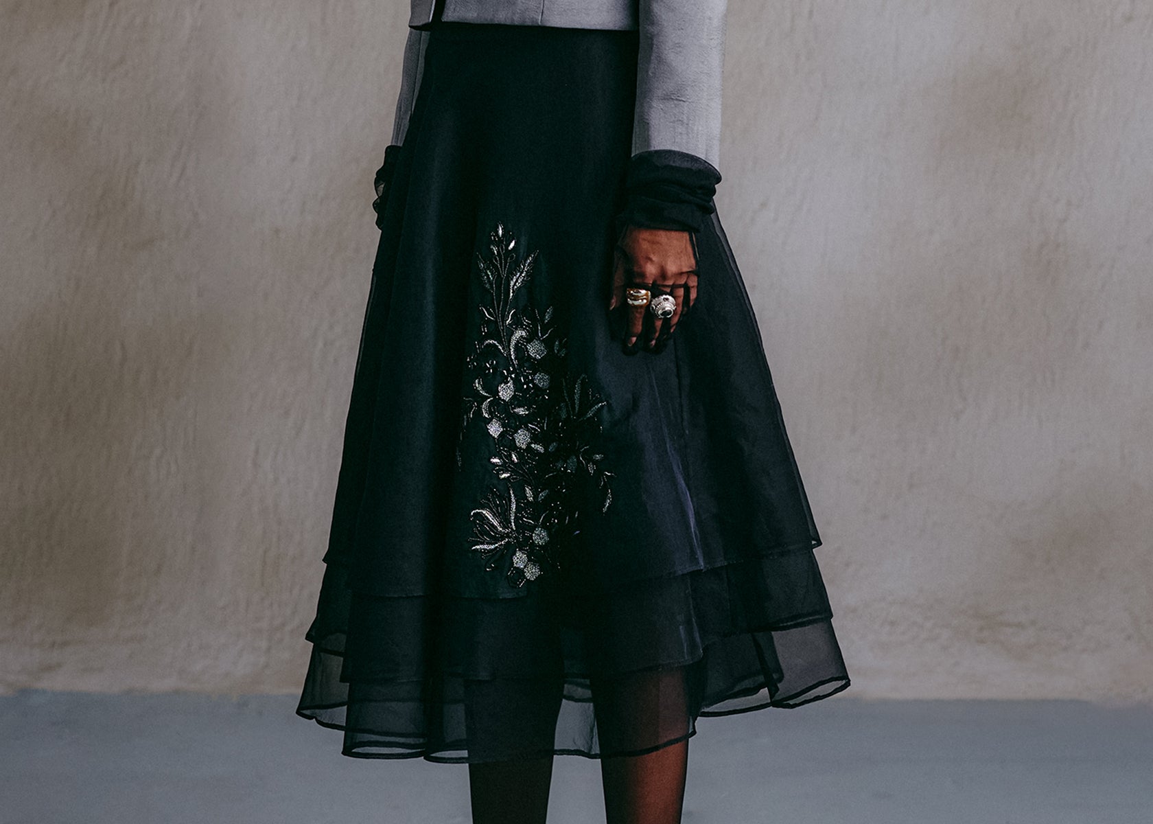 A black layered skirt with tonal embroidery cascading along one side. Light moves softly through its tiers, anchoring detail in depth.