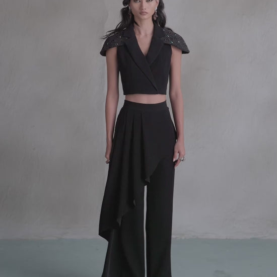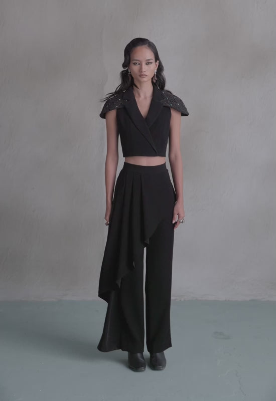 Tailored black trousers with a soft asymmetric pleated overlay—structured, fluid, and grounding.