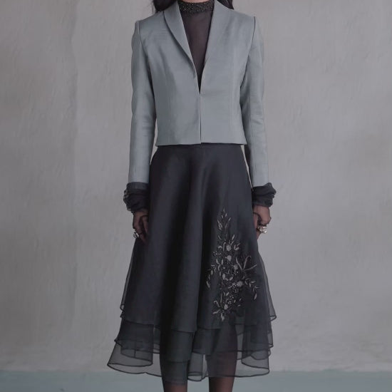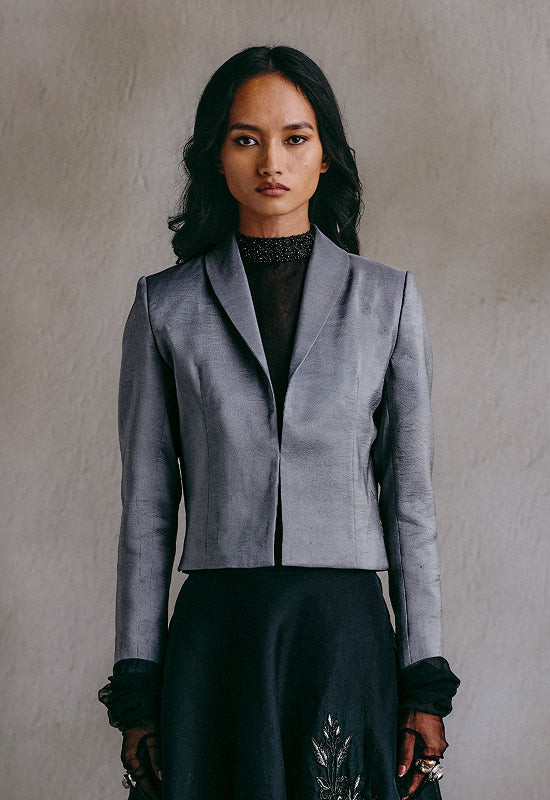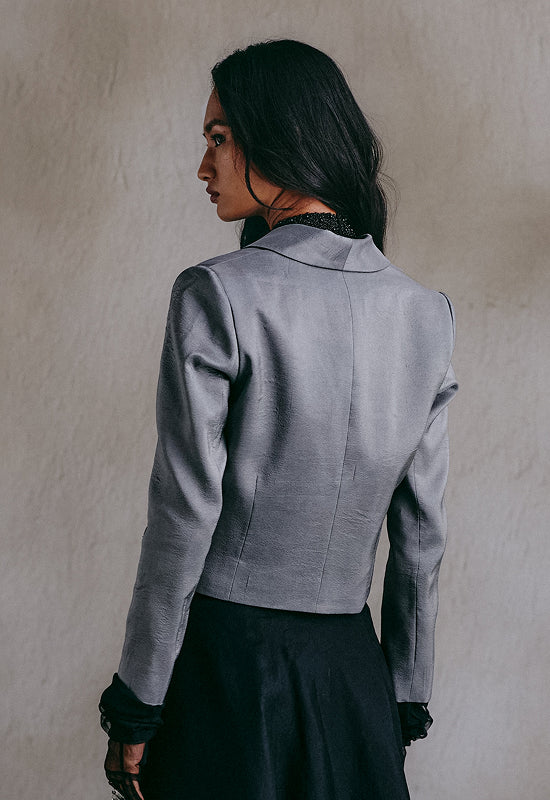 A tailored silver blazer cut in a clean, structured line. Sharp, minimal, and commanding without excess.