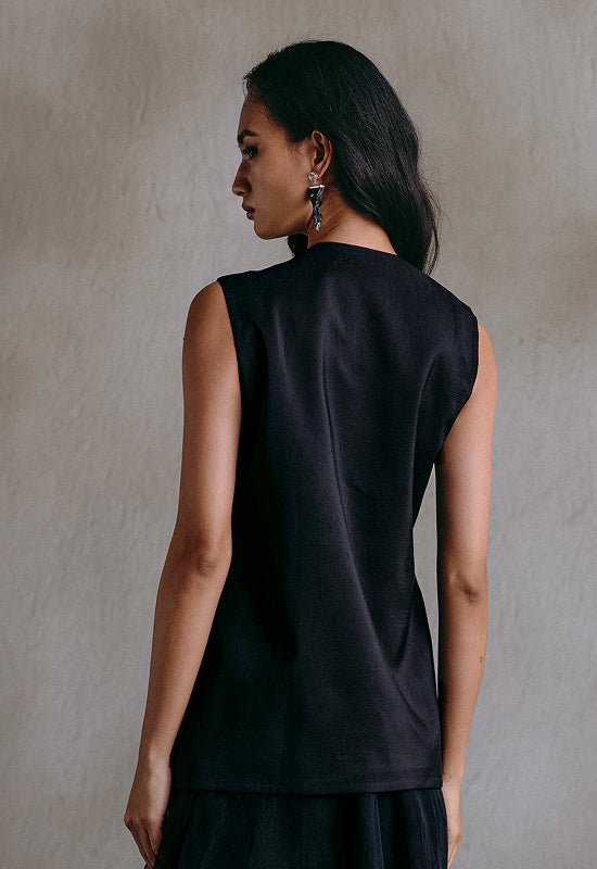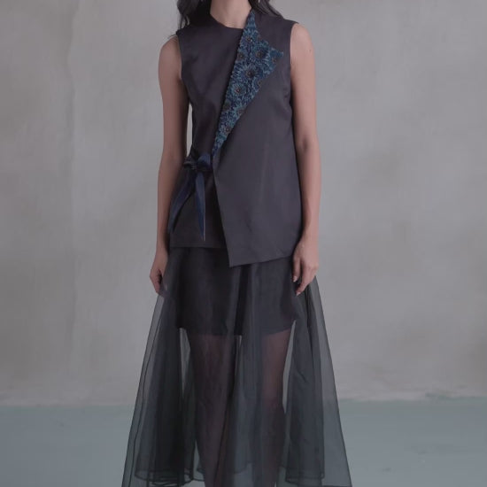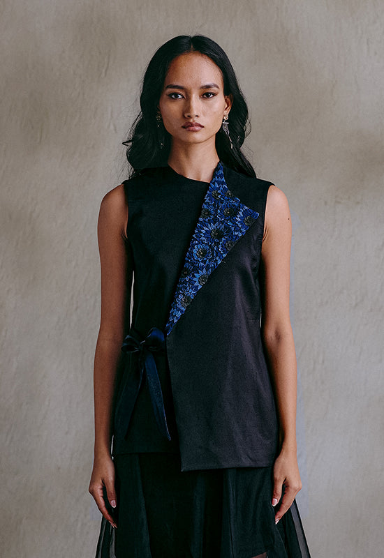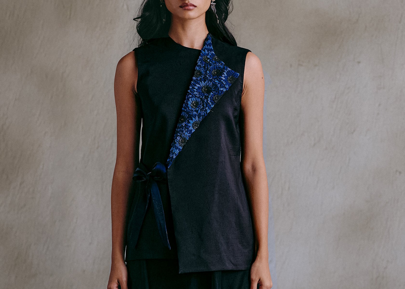 A sleeveless black top defined by a diagonal panel of blue ombré 3D florals and a tie detail on one side. A single line of contrast adds quiet power to a clean silhouette.