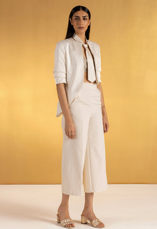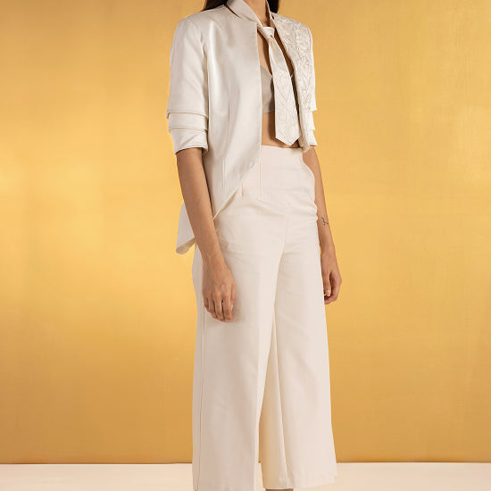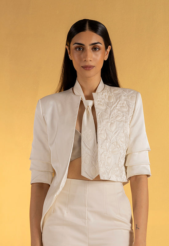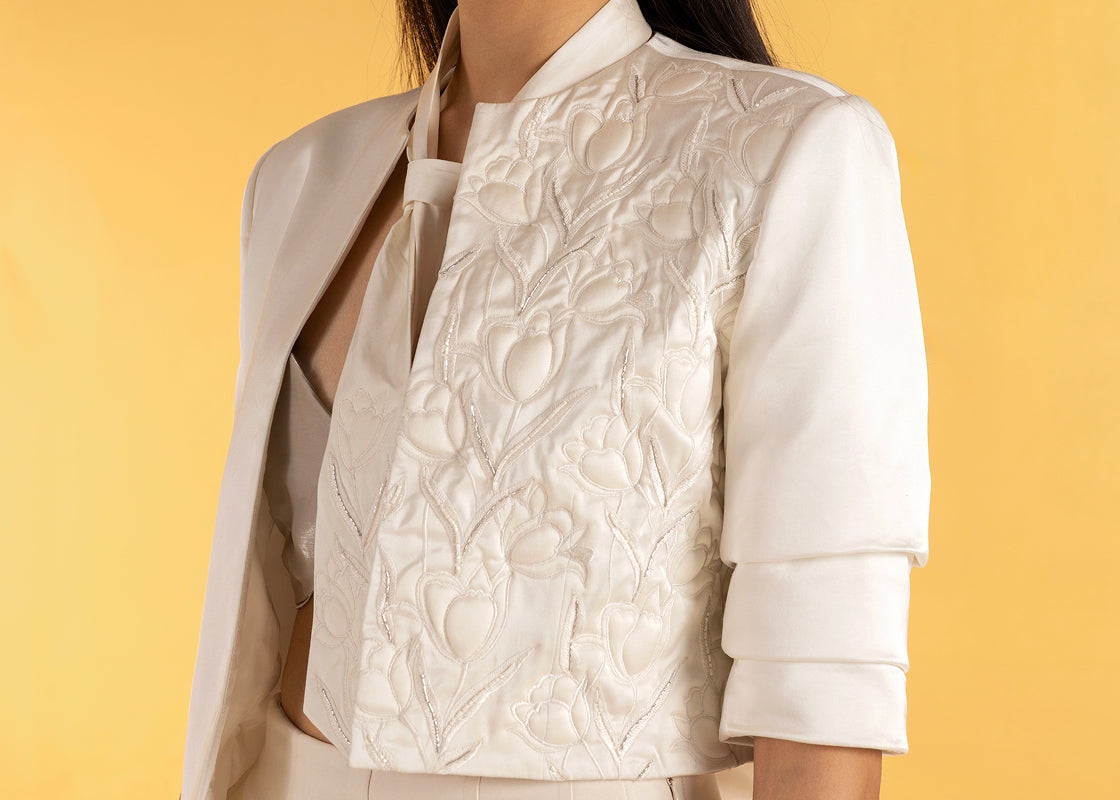 A tailored expression of softened power, The Bloom Directive reimagines botanical motifs through a commanding lens. The raised floral embroidery, its stems and petals rendered like etchings of quiet resilience. The matching tie, sculptural and precise, extends the motif into a badge of intent.
