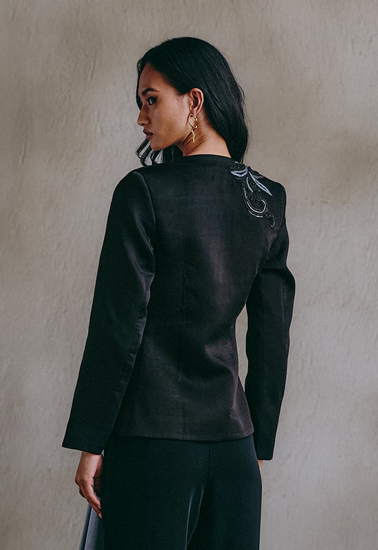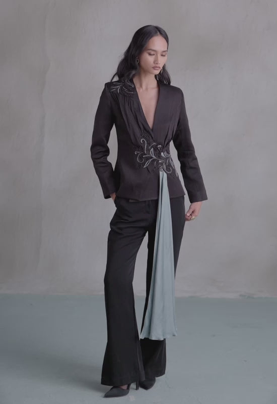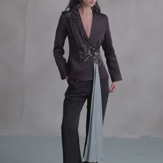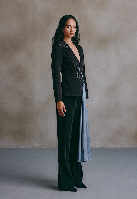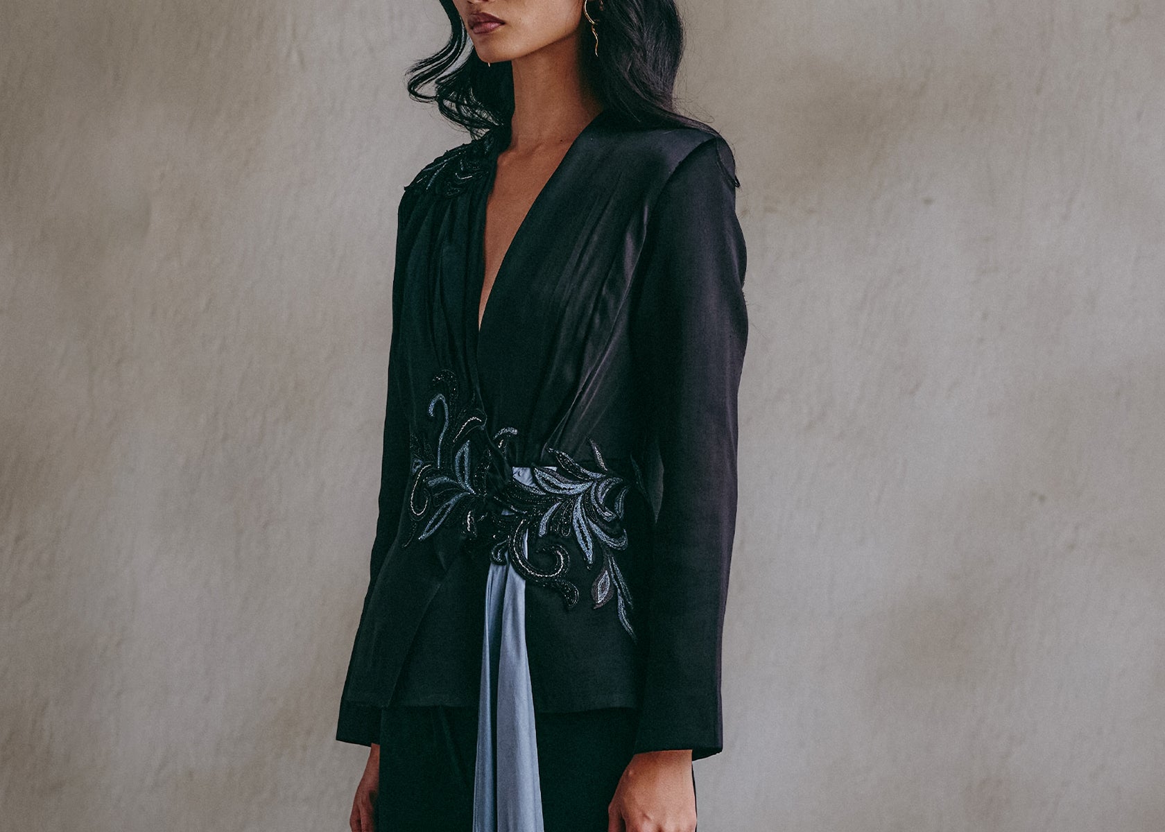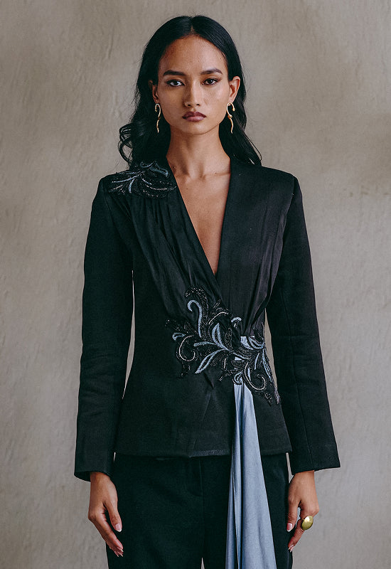 A black blazer defined by blue and black embroidery and a soft, fluid blue drape. The detailing sweeps across the waist and shoulders, creating a quiet interplay of depth and ease — structured tailoring meeting twilight grace.