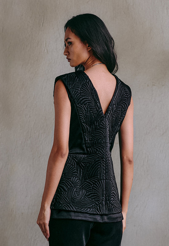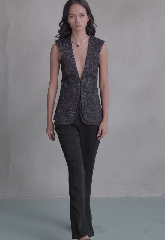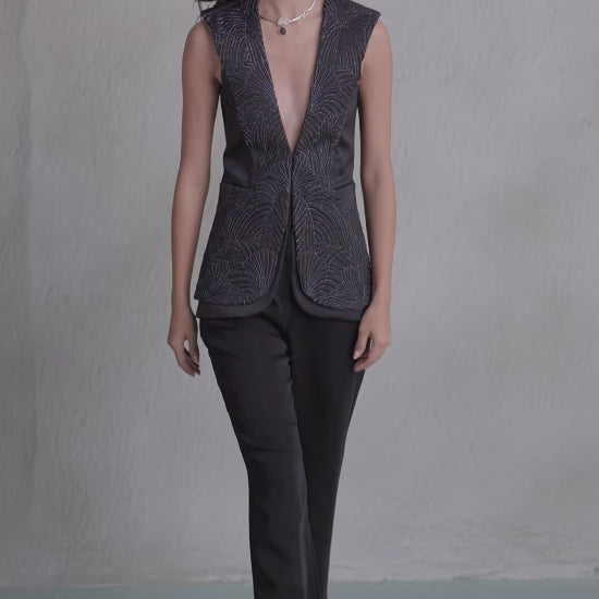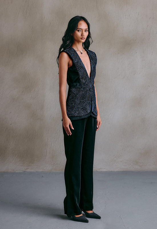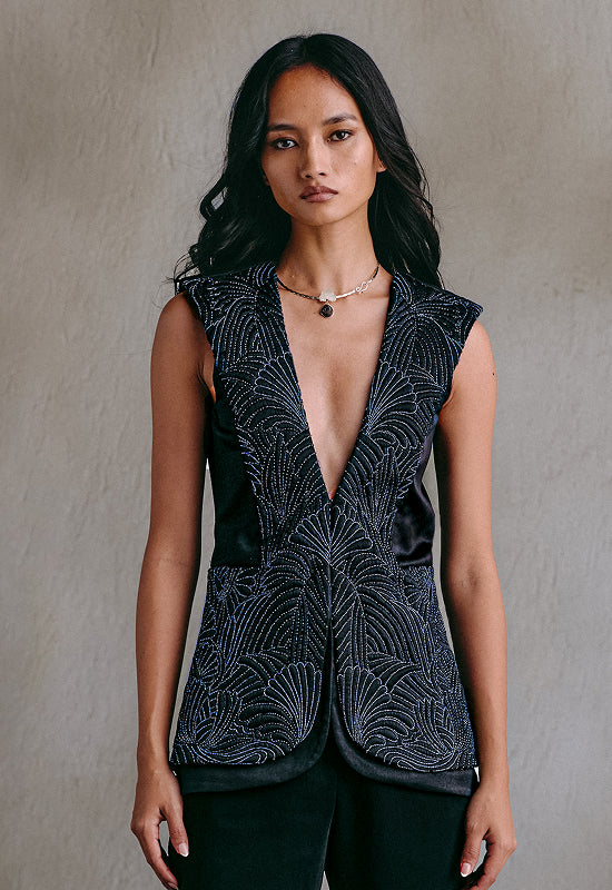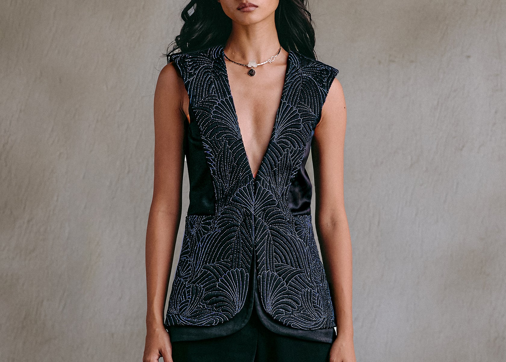 A sculpted black jacket traced with fine metallic blue embroidery. The surface catches light like quiet sparks, shifting between depth and glow. It’s a piece that speaks through texture—subtle, assured, and arresting.