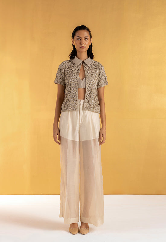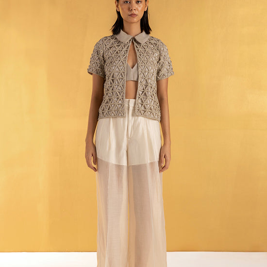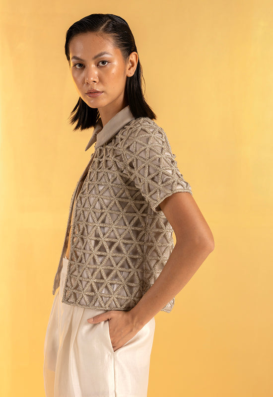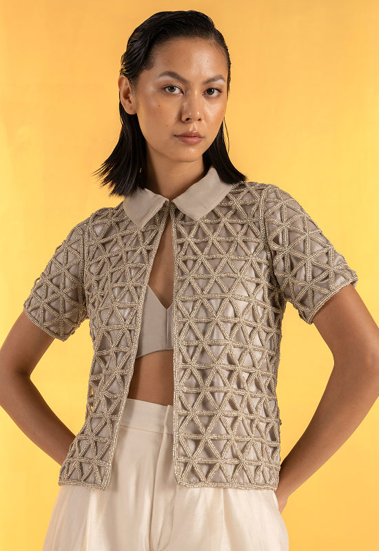 The Gilded Grid is a study in transparency and power. Each intersection of the hand-embroidered beads is deliberate, like points on a map charting a woman’s distinct path. Its soft collar and open front contrast with the graphic precision of the pattern, creating harmony between ease and assertion.