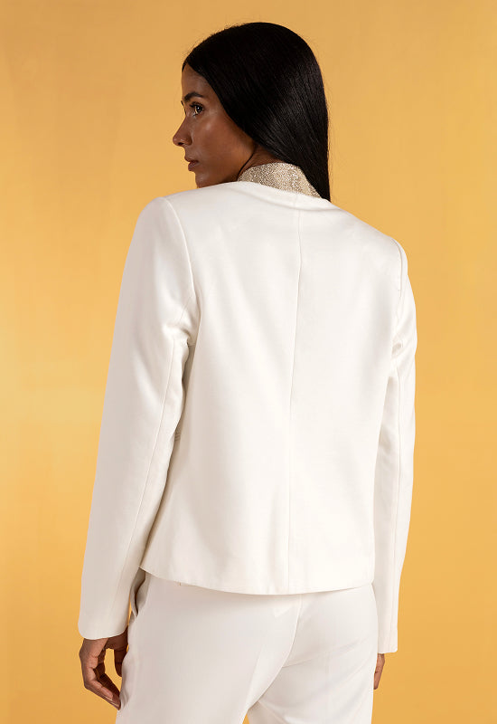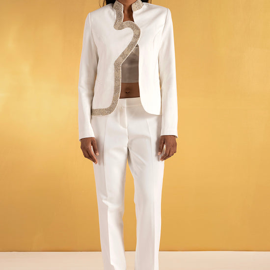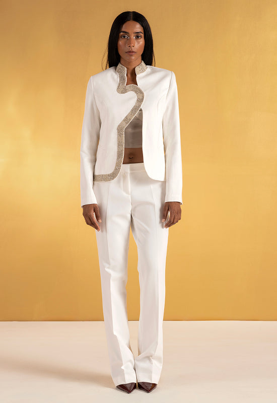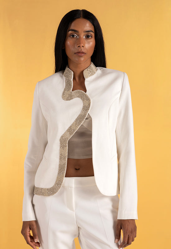 The Liquid Line is a tailored jacket in soft chalk white, defined by a sweeping, asymmetric placket traced in glistening micro-beads. The embellishment flows from the high collar down to the hem like a stream of molten light — sculptural, precise, and impossible to overlook.