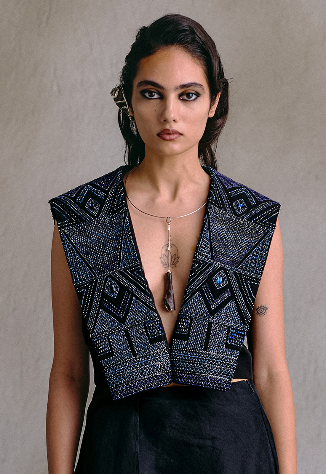 A two-panel black crop jacket hand-embroidered in ombré blue, merging geometry with glow. Its angular cut and precise lines give it the presence of quiet power, while the tonal shimmer draws the eye in without ever demanding it