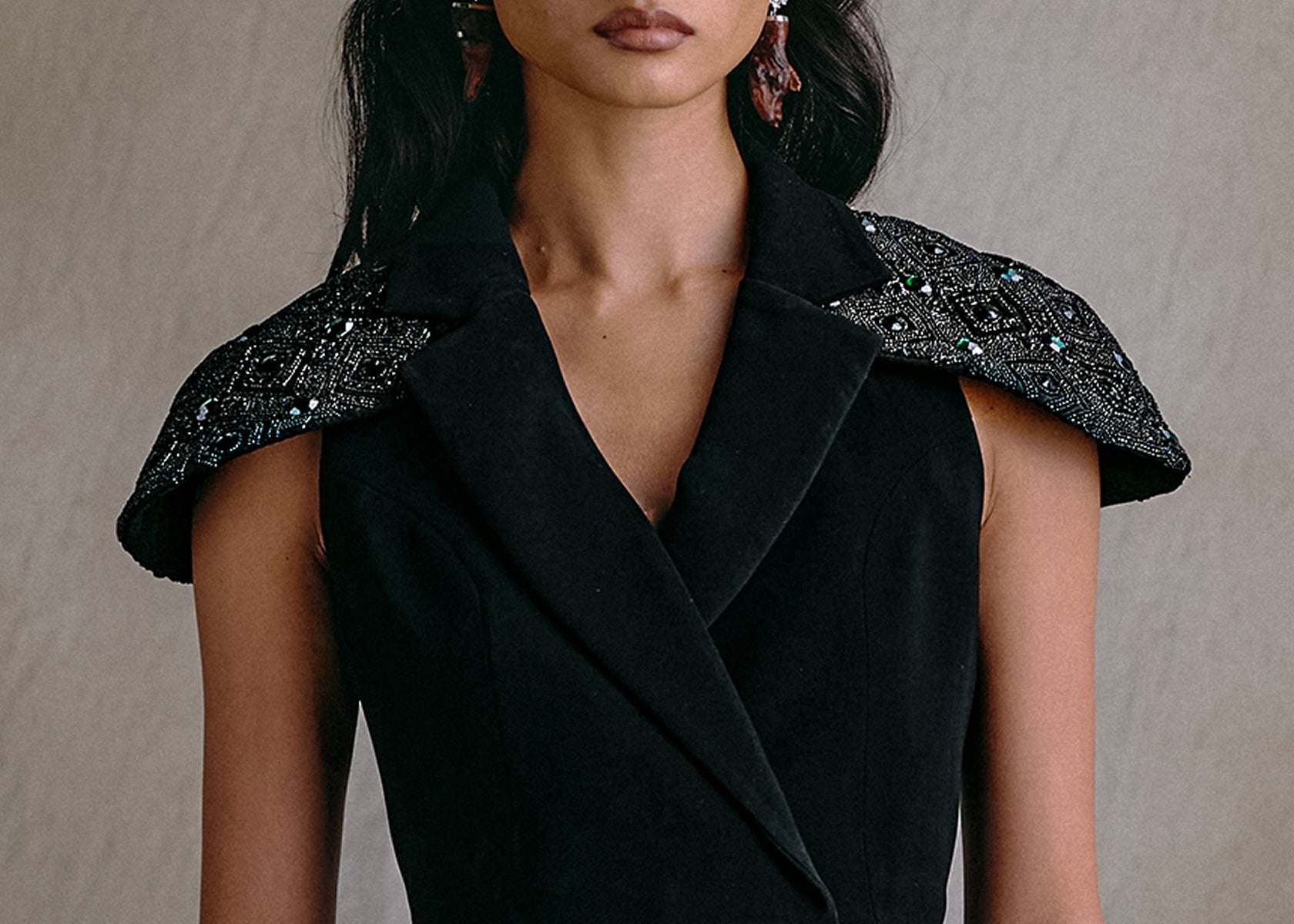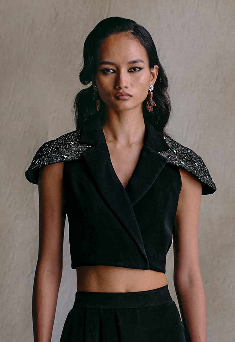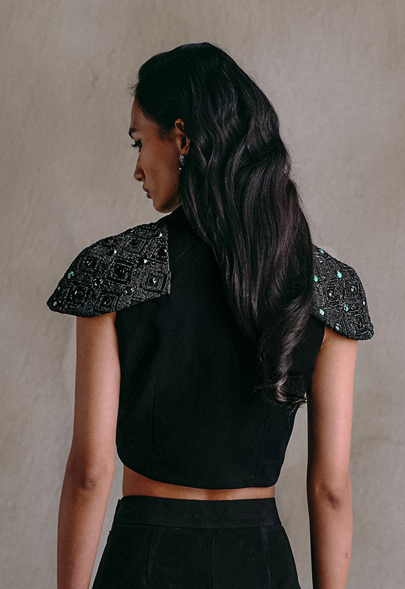 A sculpted black crop jacket that anchors itself on a clean, angular front and powerful shoulders. Hand-embellished with intricate stonework, the shoulders shimmer with controlled fire—never loud, always deliberate. It’s a piece that frames the torso like quiet armour, letting the glow live at the edges.