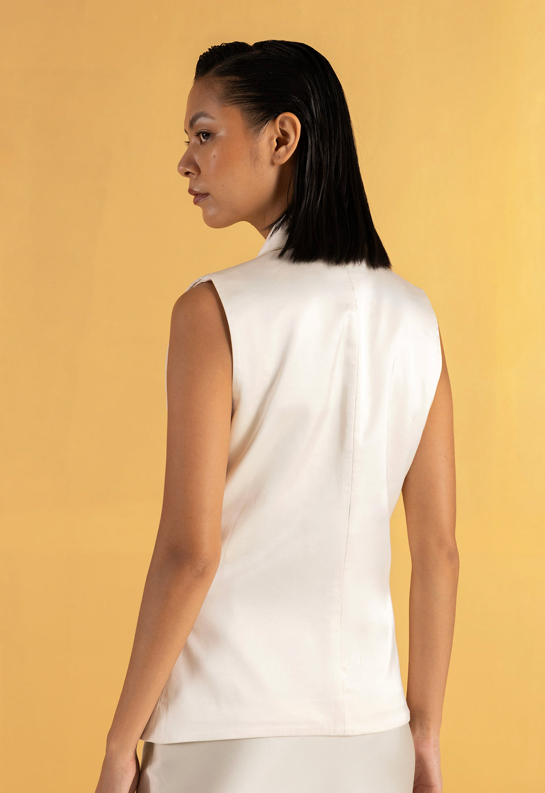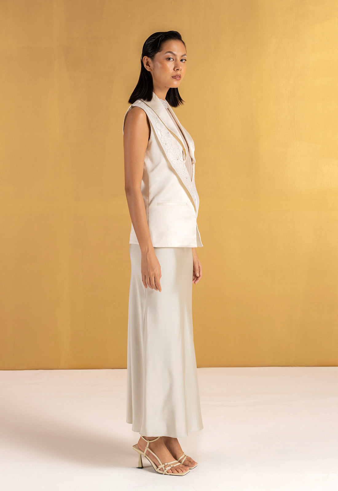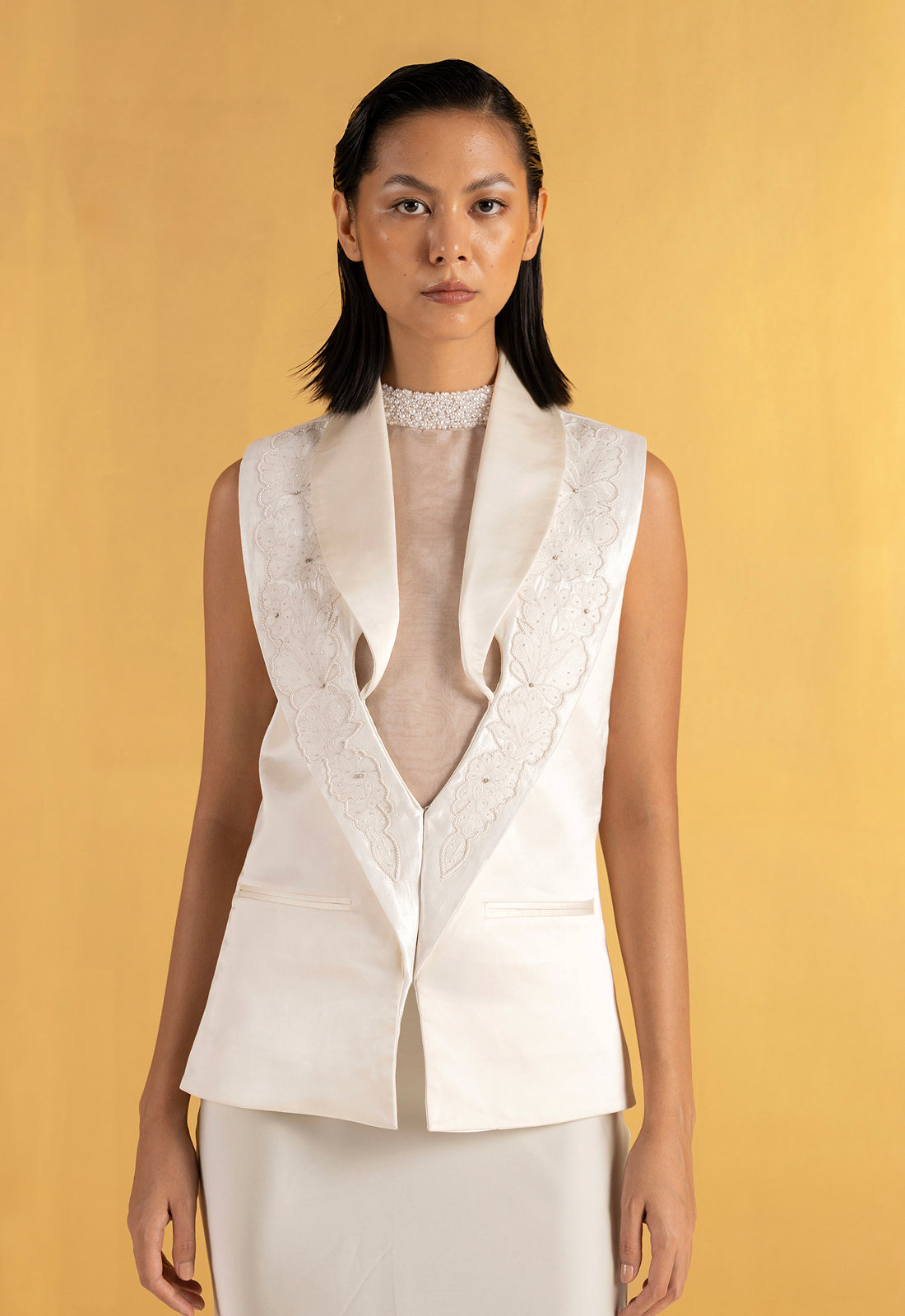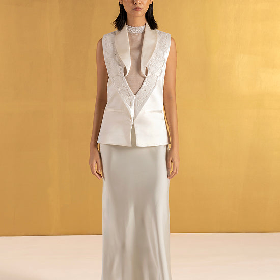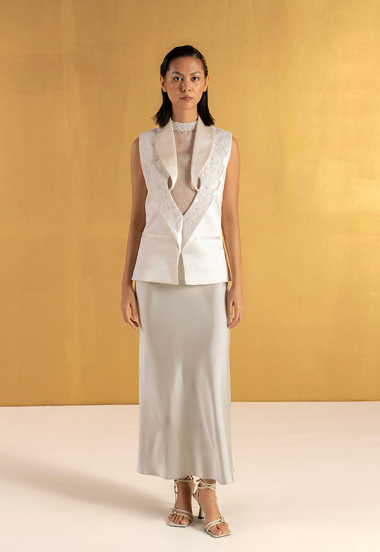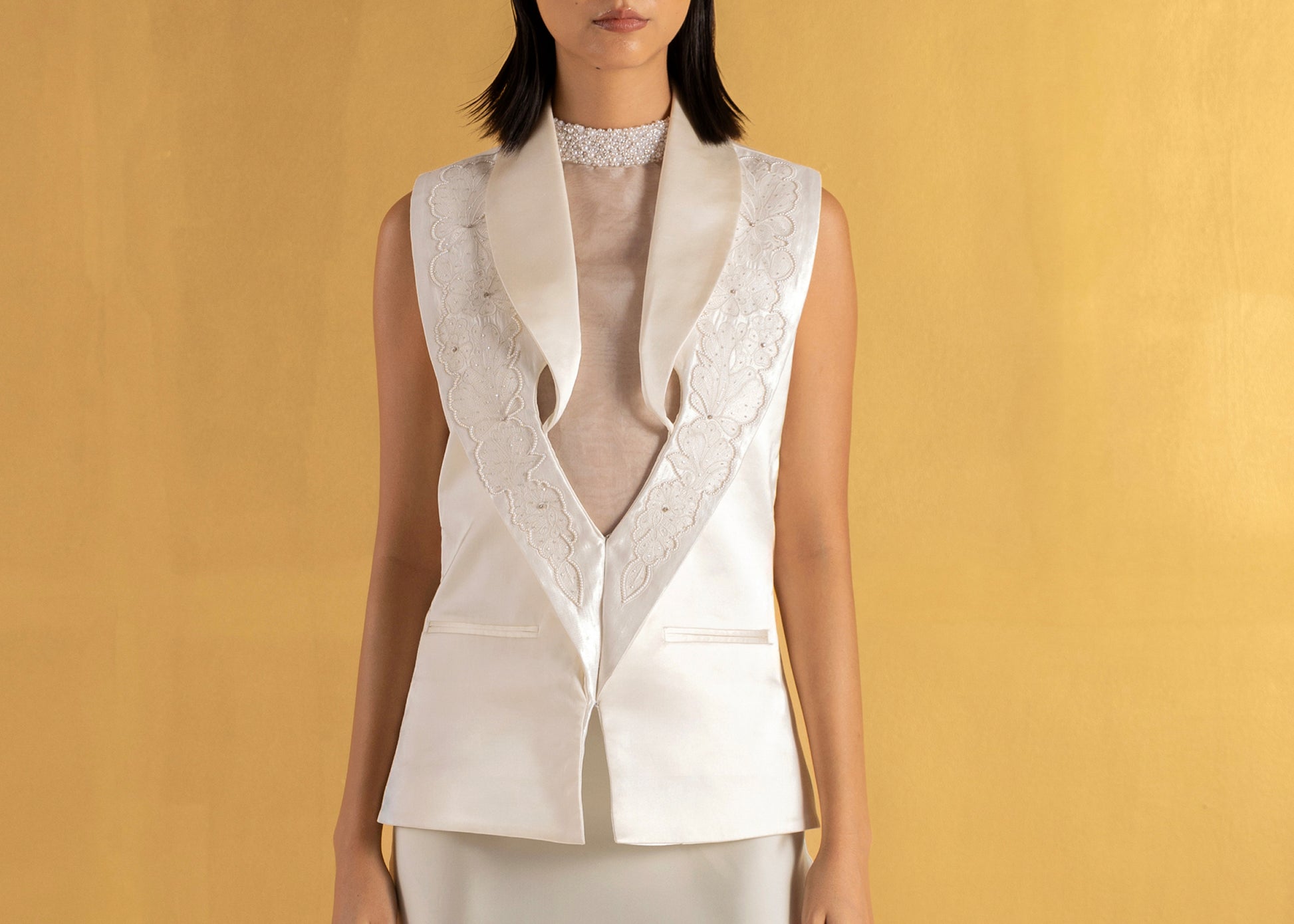 Crafted in pearl-toned satin, The Petal Lapel is a longline sleeveless vest that plays with softness and strength. The threadwork, inspired by pressed petals, offers a quiet contrast against the clean body, elevating the piece with restrained romance.