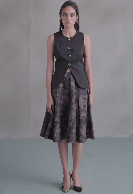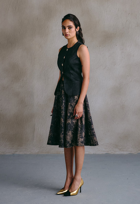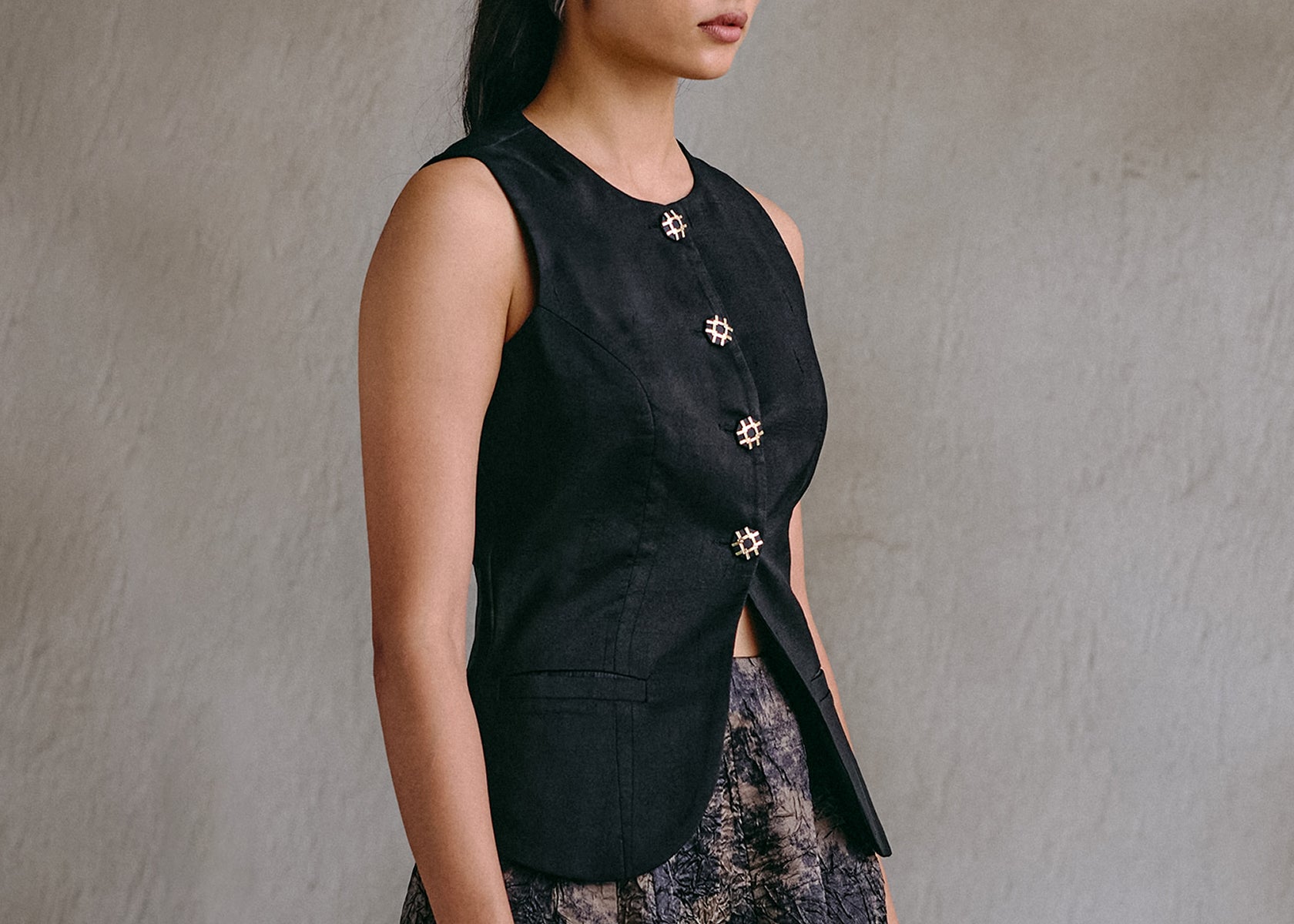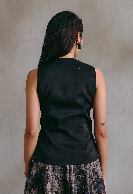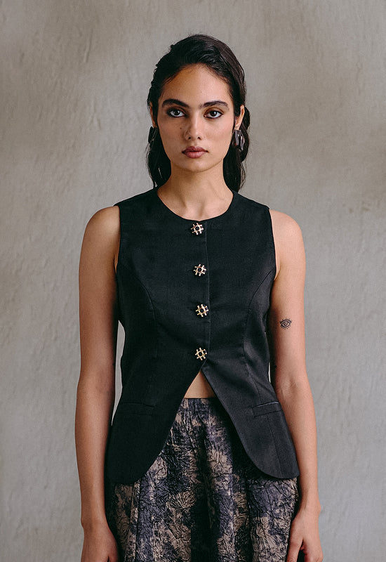 A sculpted black silk waistcoat with sharp lines and gold buttons. The clean front tapers into a subtle curve, framing the torso with quiet precision. A piece that speaks through structure, not noise.