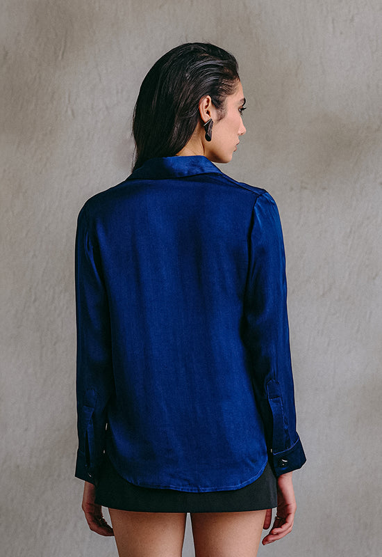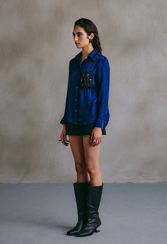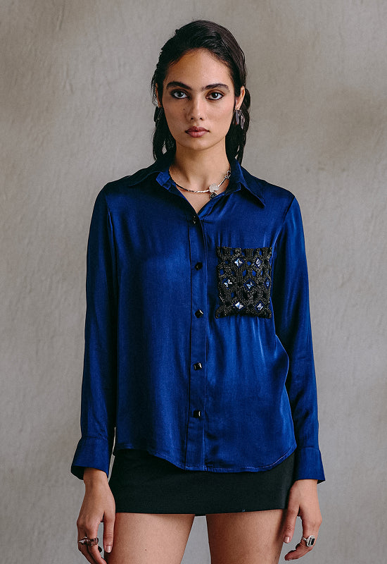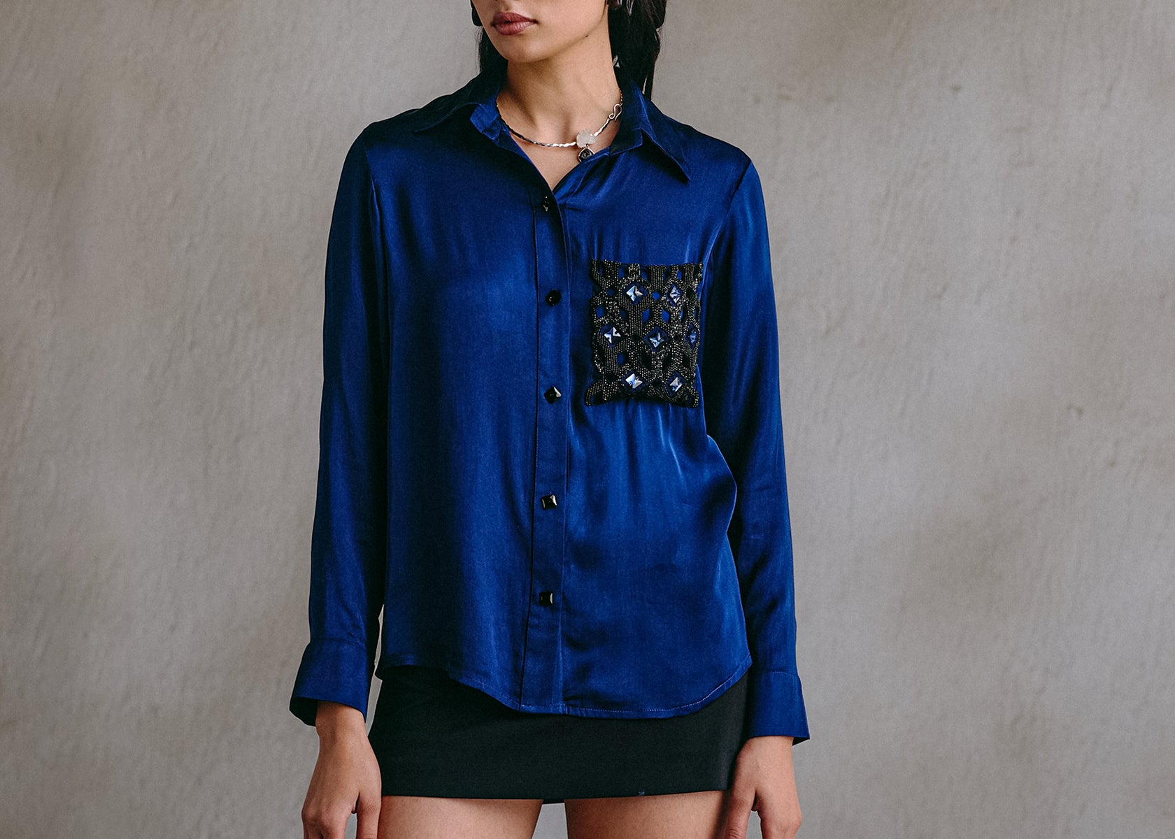 A deep cobalt blue shirt accented with a single cutwork pocket, intricately embroidered and stoned by hand. A deliberate mark of detail on an otherwise clean canvas.