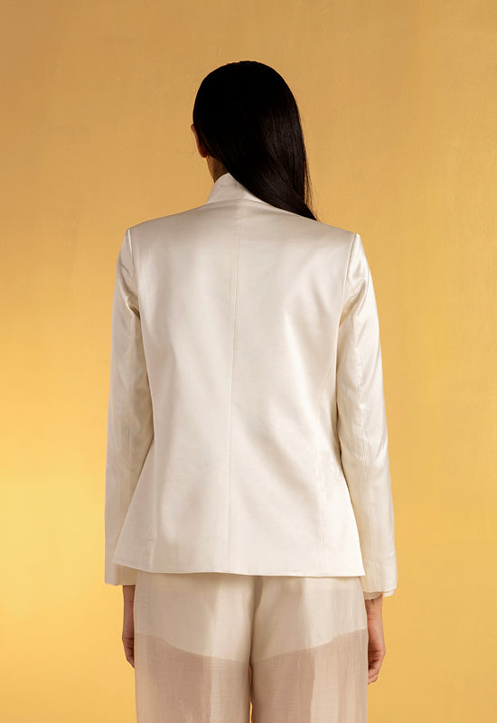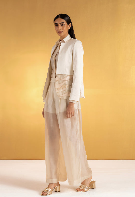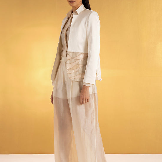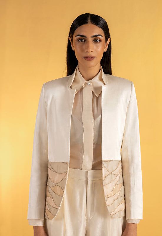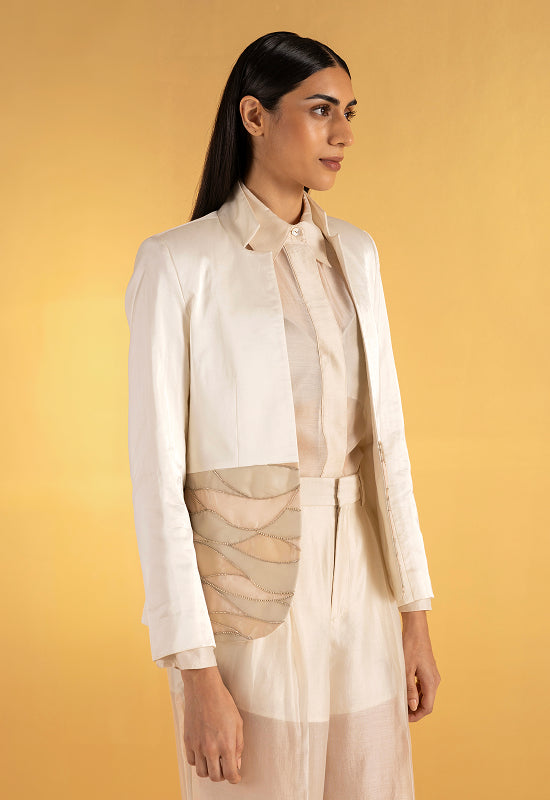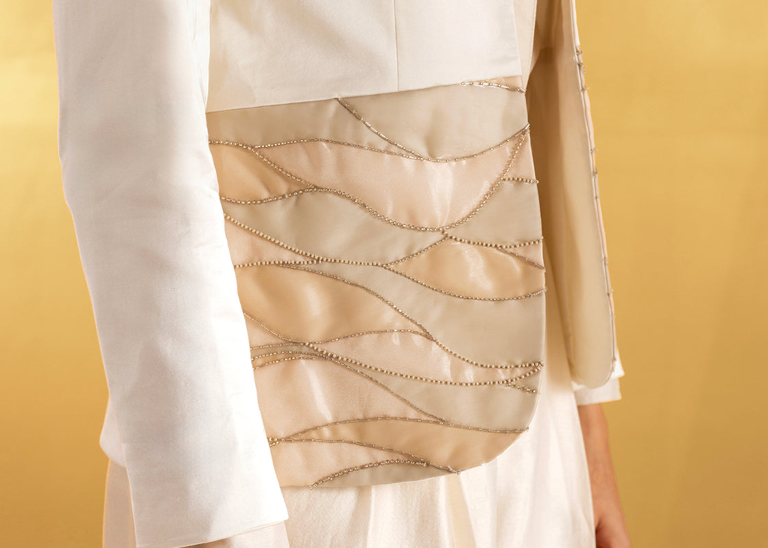 A structured open-front jacket in pale cream, The Quiet Current is designed to flow from stillness into movement. The upper half is kept clean and minimal, while the lower panels ripple with layered waves of blush, sand, and oyster — gently beaded for sculptural depth.