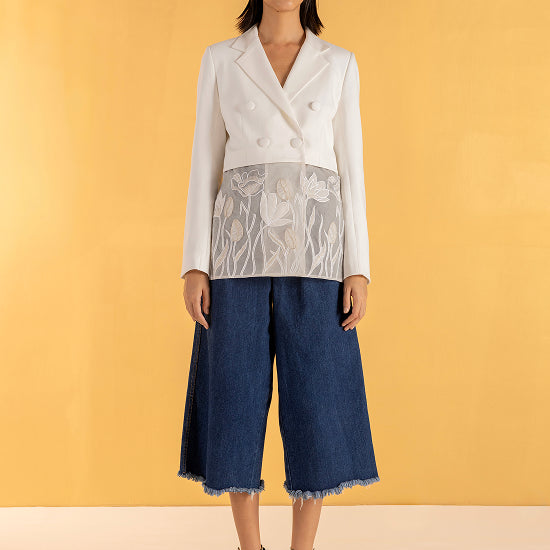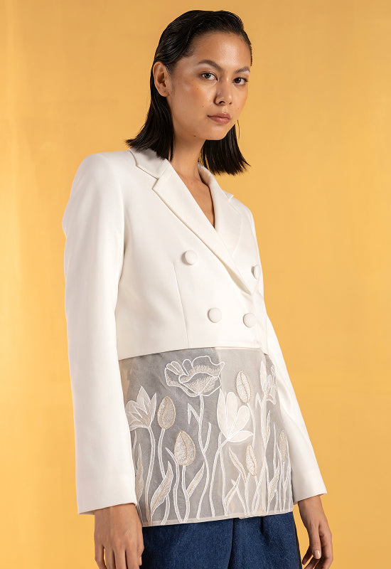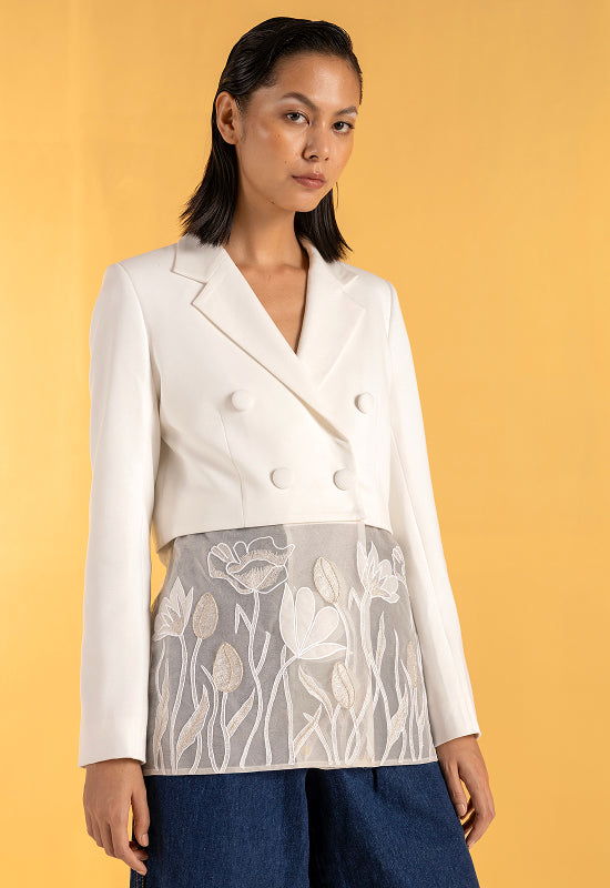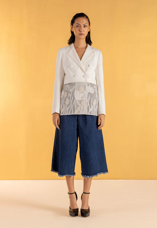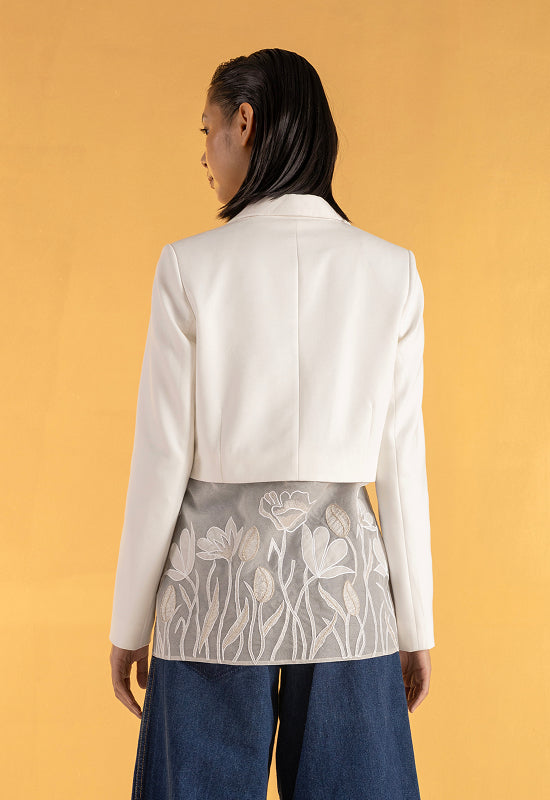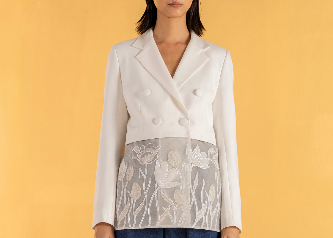A tailored blazer that embodies both refinement and romance, The Rooted Flare transitions smoothly from a structured upper half, crafted in a clean, sharply cut matte alabaster, to a softer lower panel that features a sheer embroidered layer where floral motifs rise from the hem like they are growing from within the garment.