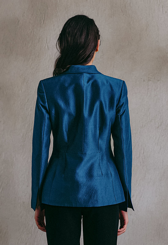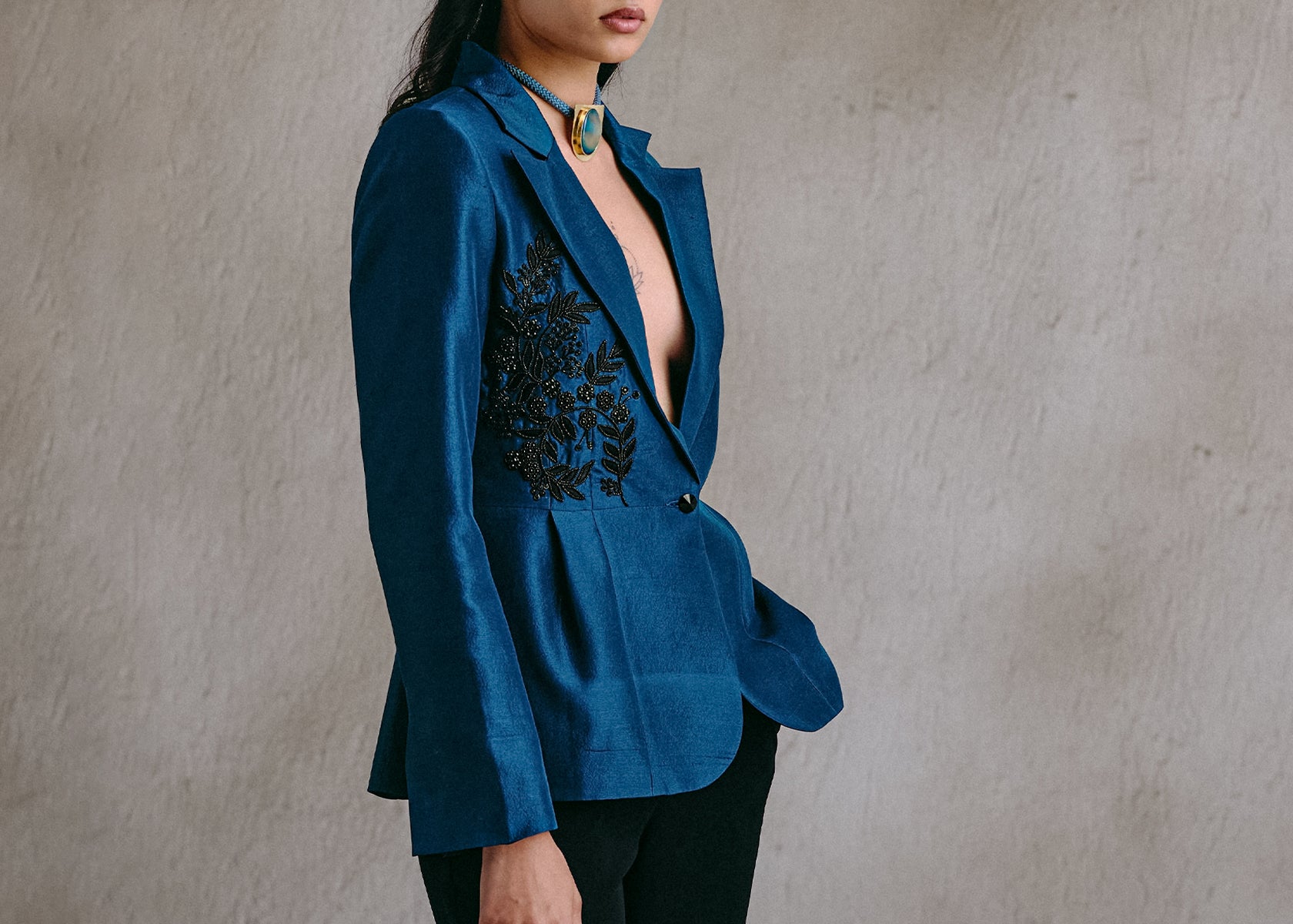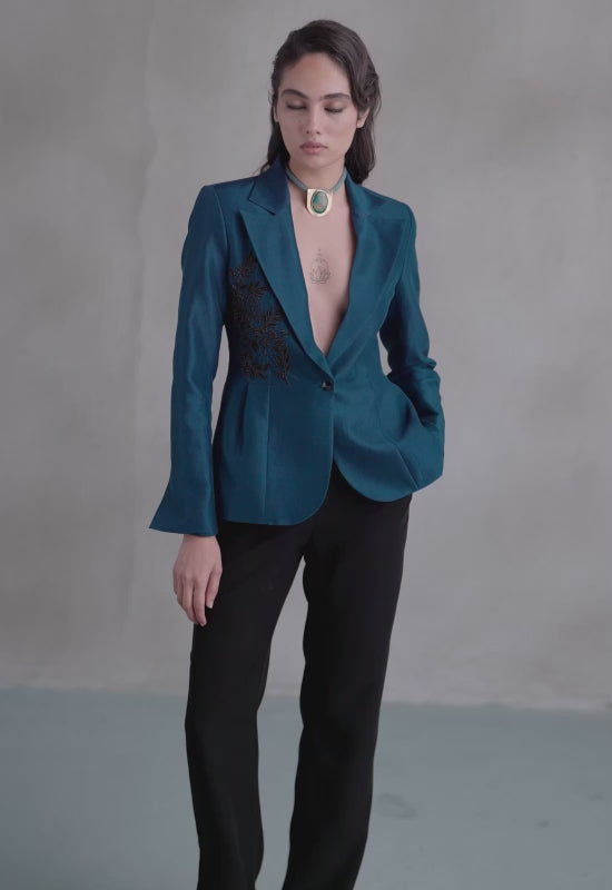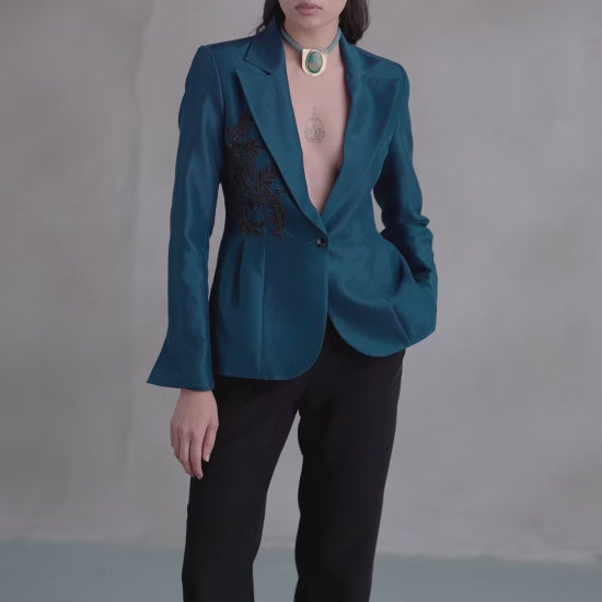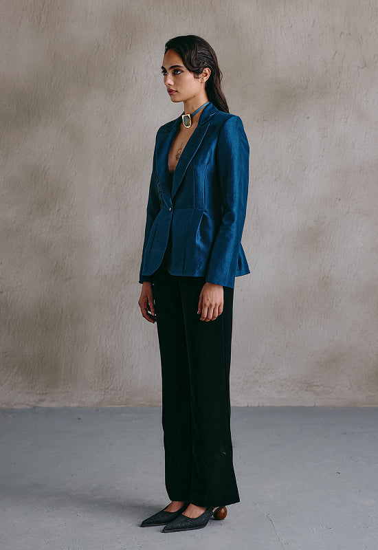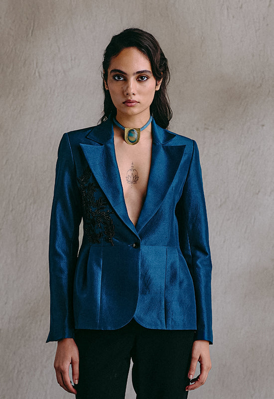 A sculpted blue peplum blazer with black embroidery tracing one side. Precision-cut and assertive in form, it channels structure with quiet sensuality — a piece that stands at the intersection of control and ease.