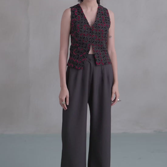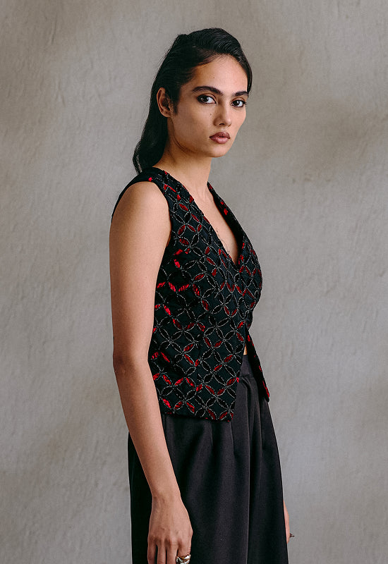 A black waistcoat covered in red velvet appliqué embroidery. The surface carries a bold rhythm—structured yet intricate, with each stitch catching the light like a quiet spark against shadow.