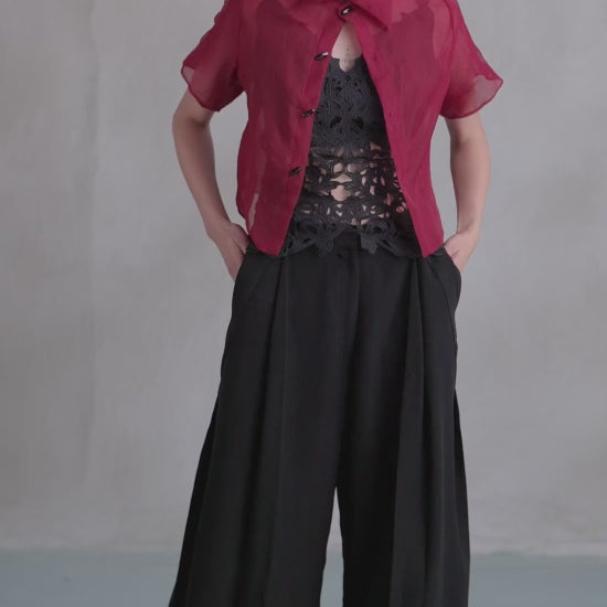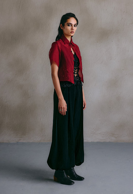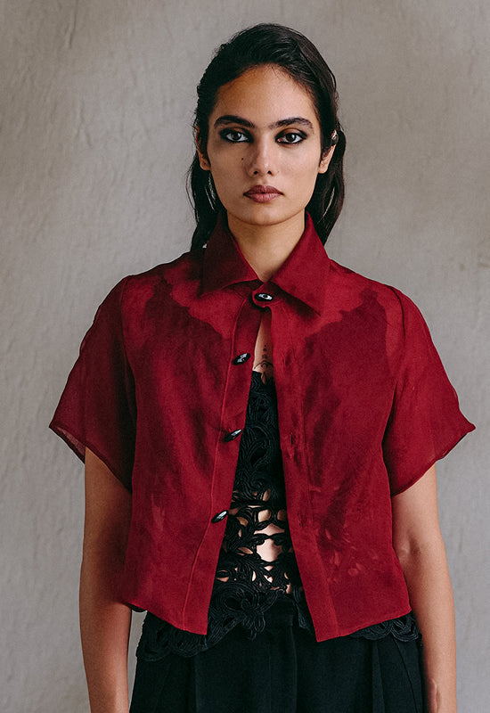 A black cutwork base layered with a red organza shirt—partly sheer, wholly arresting. The interplay of opacity and light gives the silhouette quiet depth, letting the red move like a veil over shadow.