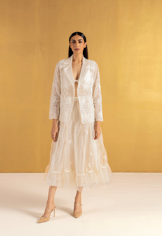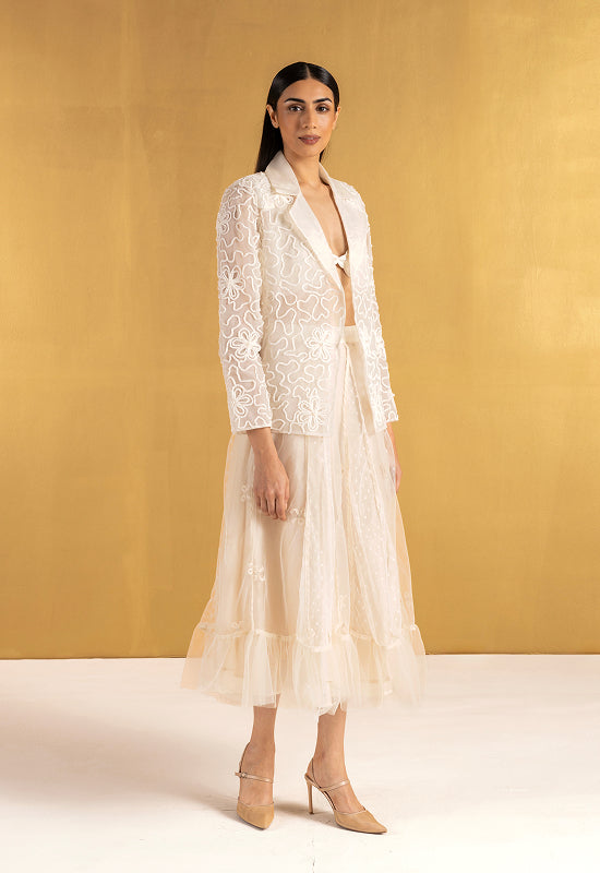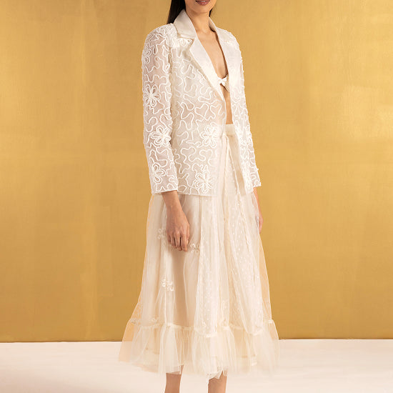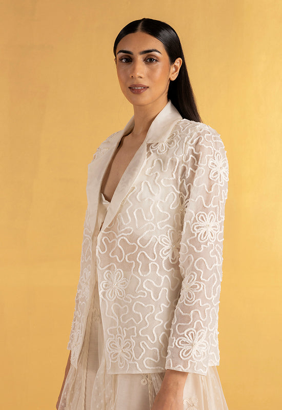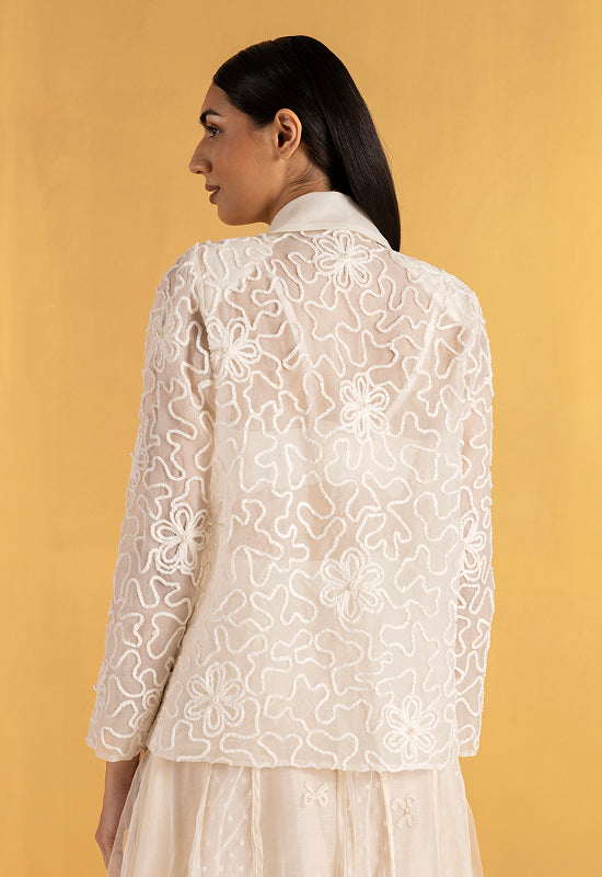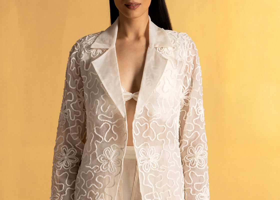 A sheer shirt-jacket in ivory organza, The Scribble Stitch is embroidered with freeform squiggles and tonal florals that ripple across the surface like a spontaneous dance.