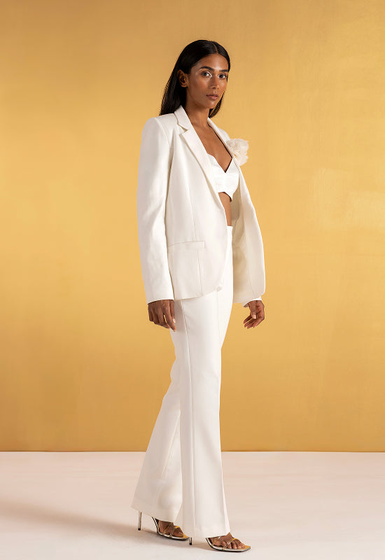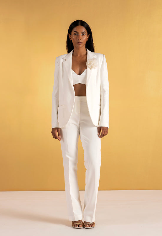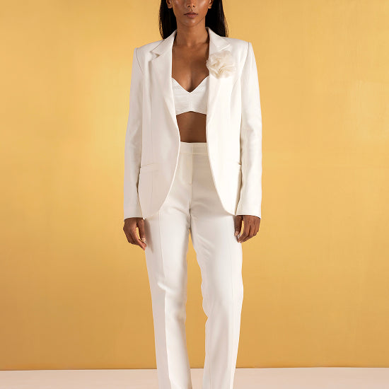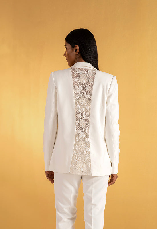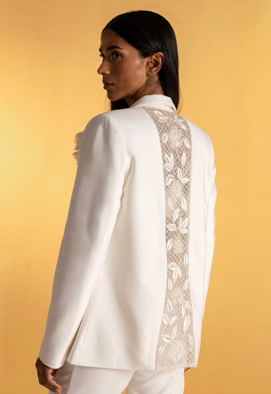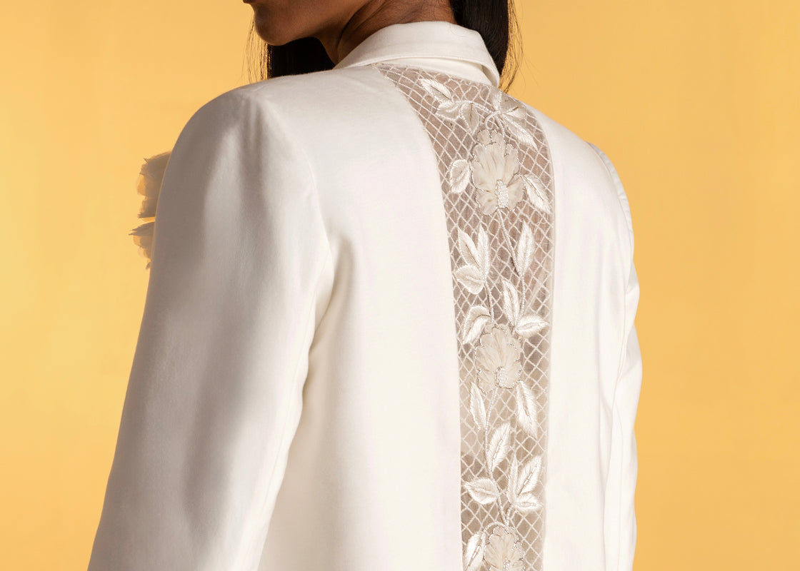 At first glance, The Secret Vine is a study in classic tailoring — a structured blazer in soft off-white with a clean front and a single sculpted flower at the collar.