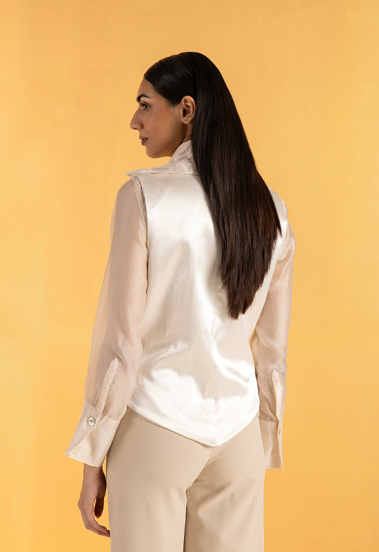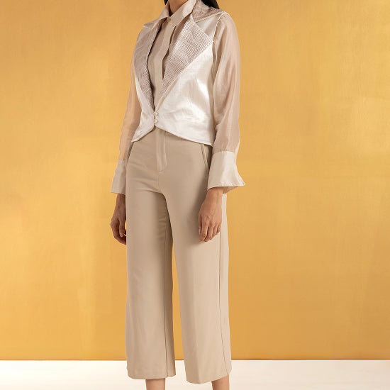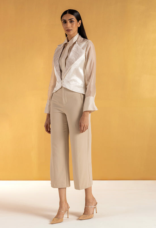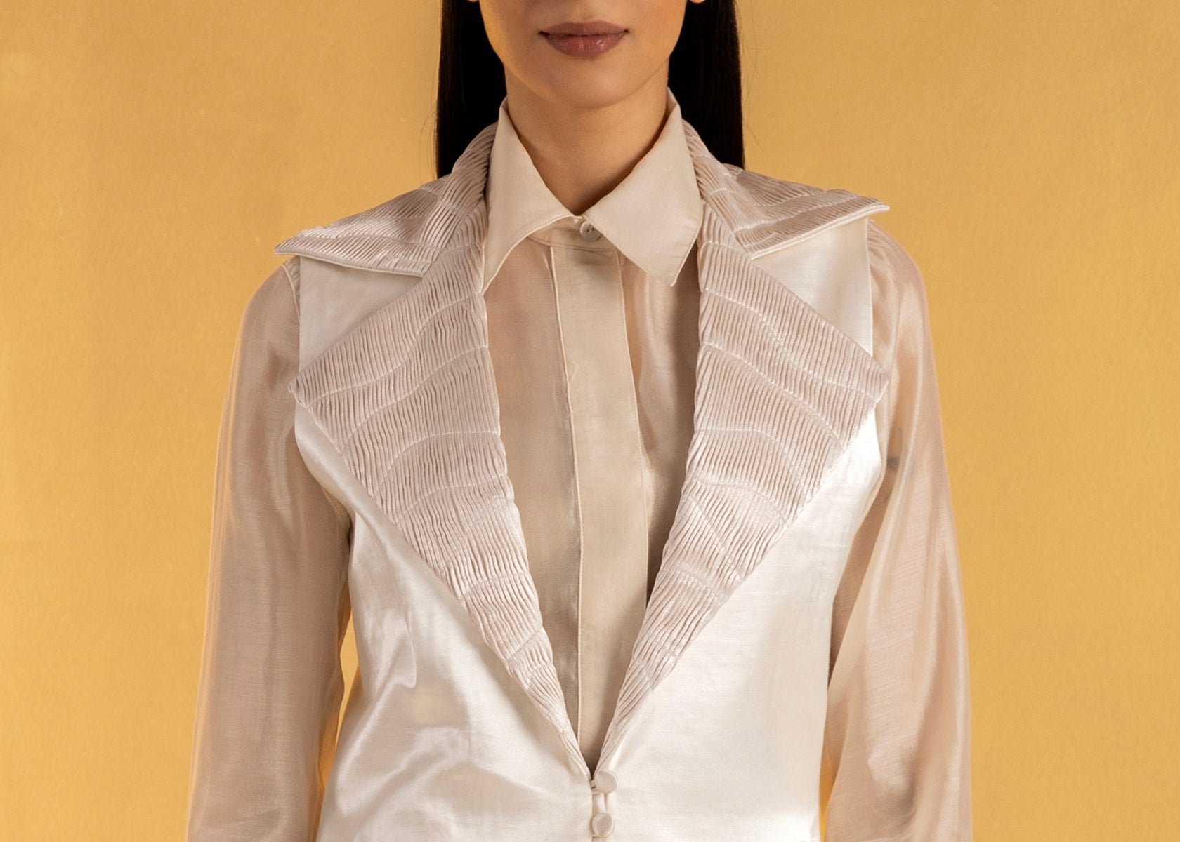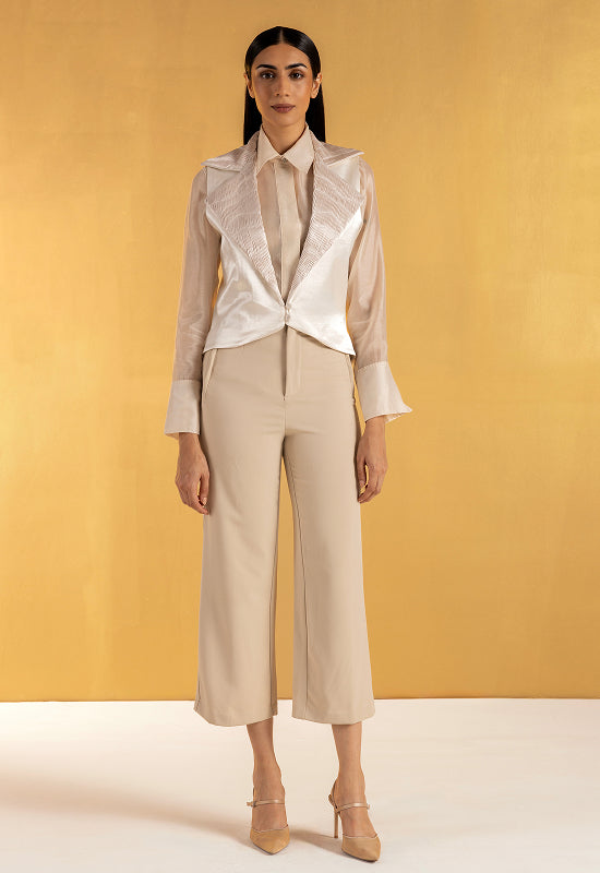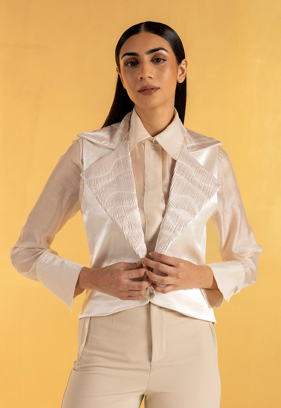 A study in contour and command, The Spine Line is a cropped ivory vest that plays with architectural precision. Its ribbed, sculpted lapels evoke the strength of a spine — central, grounding, and elegantly defined.