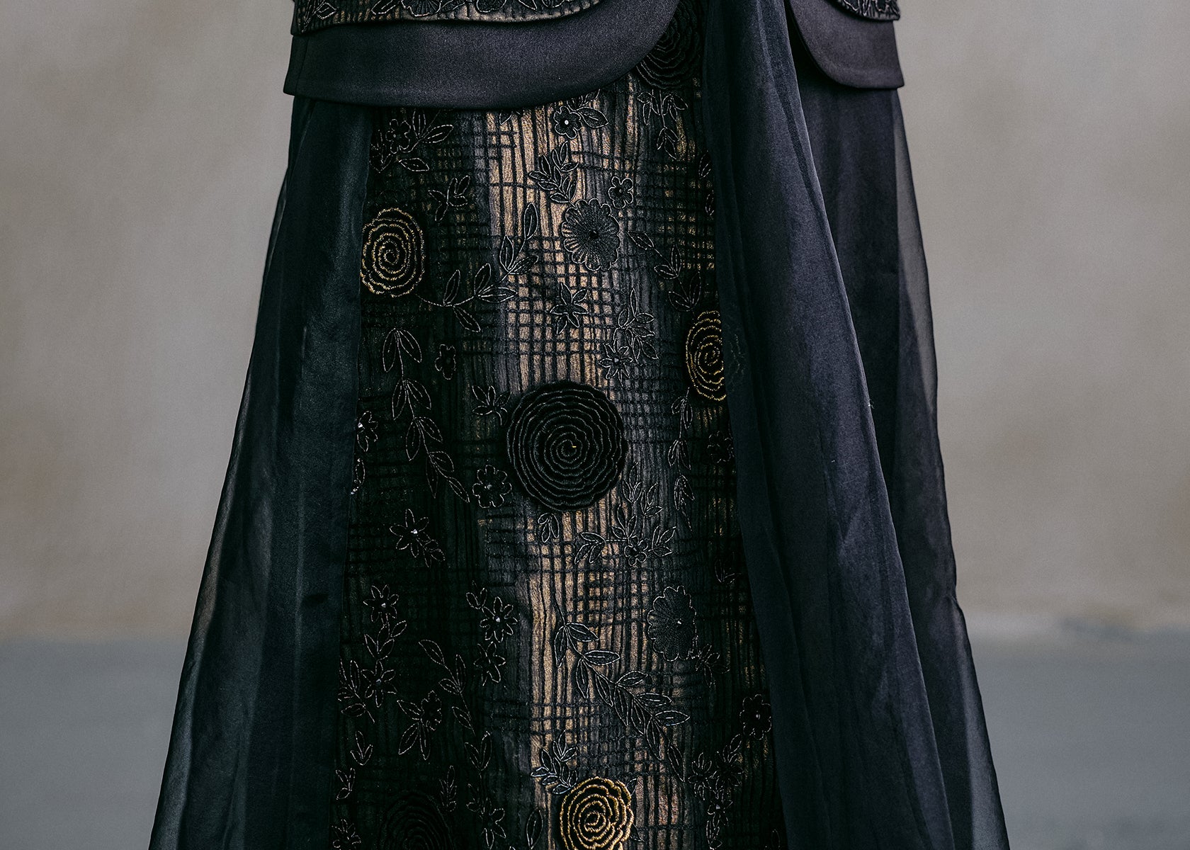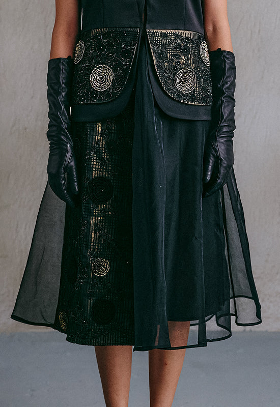 A sheer layered black skirt enriched with scattered gold 3D florals and delicate embroidery. The weightless transparency contrasts with its rich detailing, allowing the gold to glimmer softly through movement.