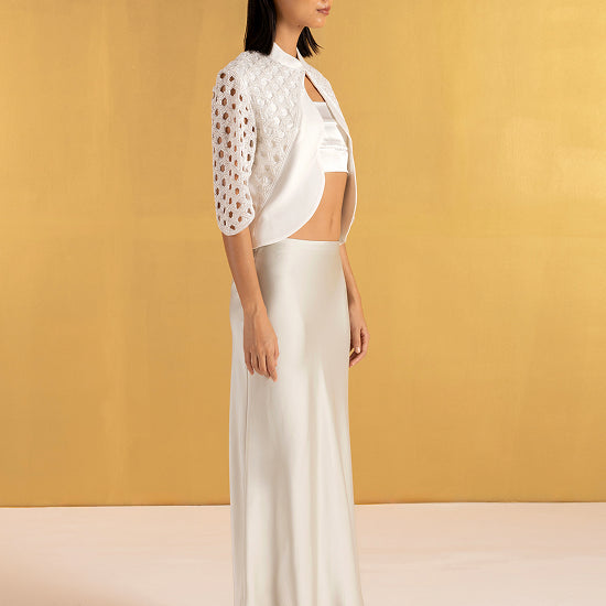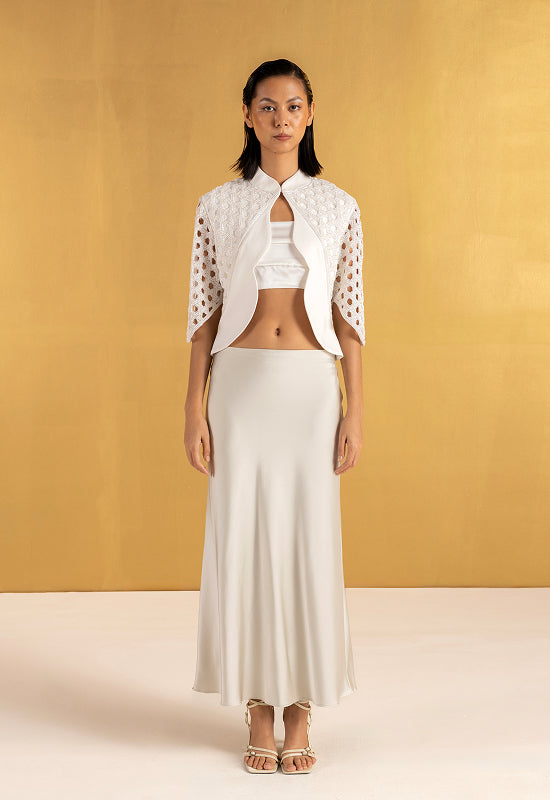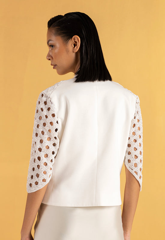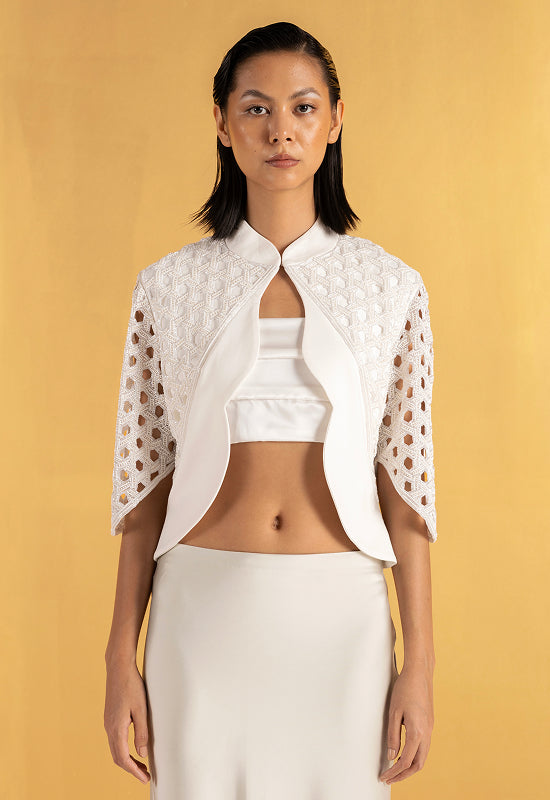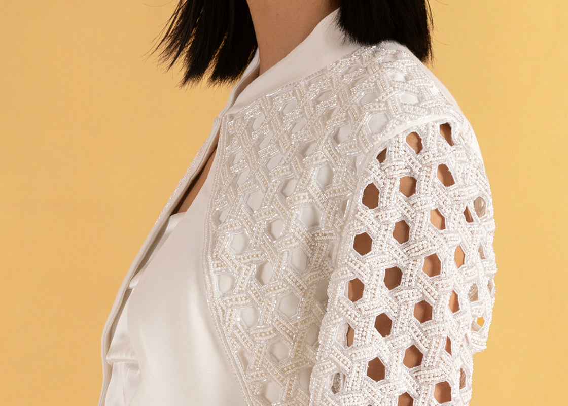A cropped cape-jacket that commands with understatement, The Woven Crest is structured yet fluid — its silhouette echoing the elegance of a modern mantle.